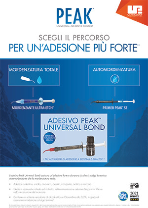 La formulazione versatile dell’adesivo Peak Universal Bond è ideale in Restaurativa diretta e indiretta, anche per la cementazione adesiva dei perni in fibra e la ricostruzione del moncone. Grazie a una percentuale di riempitivo del 7,5% e a una miscela di monomeri di fosfato sintetizzati appositamente, la sua viscosità è stata ottimizzata per ottenere uno spessore minimo del film e una resistenza eccellente. Contiene un solvente veicolante di alcool etilico e polimerizza con tutte le lampade dentali per la fotopolimerizzazione, comprese le lampade LED.