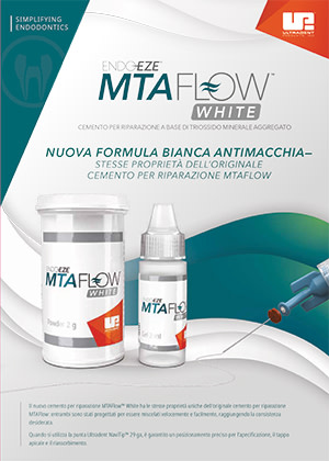 Cemento per riparazione a base di Triossido Minerale AggregatoOttieni la stessa facilità e sicurezza di miscelazione del cemento per riparazione MTA Flow con la consisistenza desiderata, ma con una formula incolore. Il Cemento per ripazione MTAFlow White è stato è concepito per essere miscelato velocemente e facilmente, raggiungendo la consistenza ideale per differenti tipologie di procedure. Inoltre può essere applicato tramite le siringhe e i puntali Ultradent, assicurando un posizionamento preciso per un trattamento efficace.